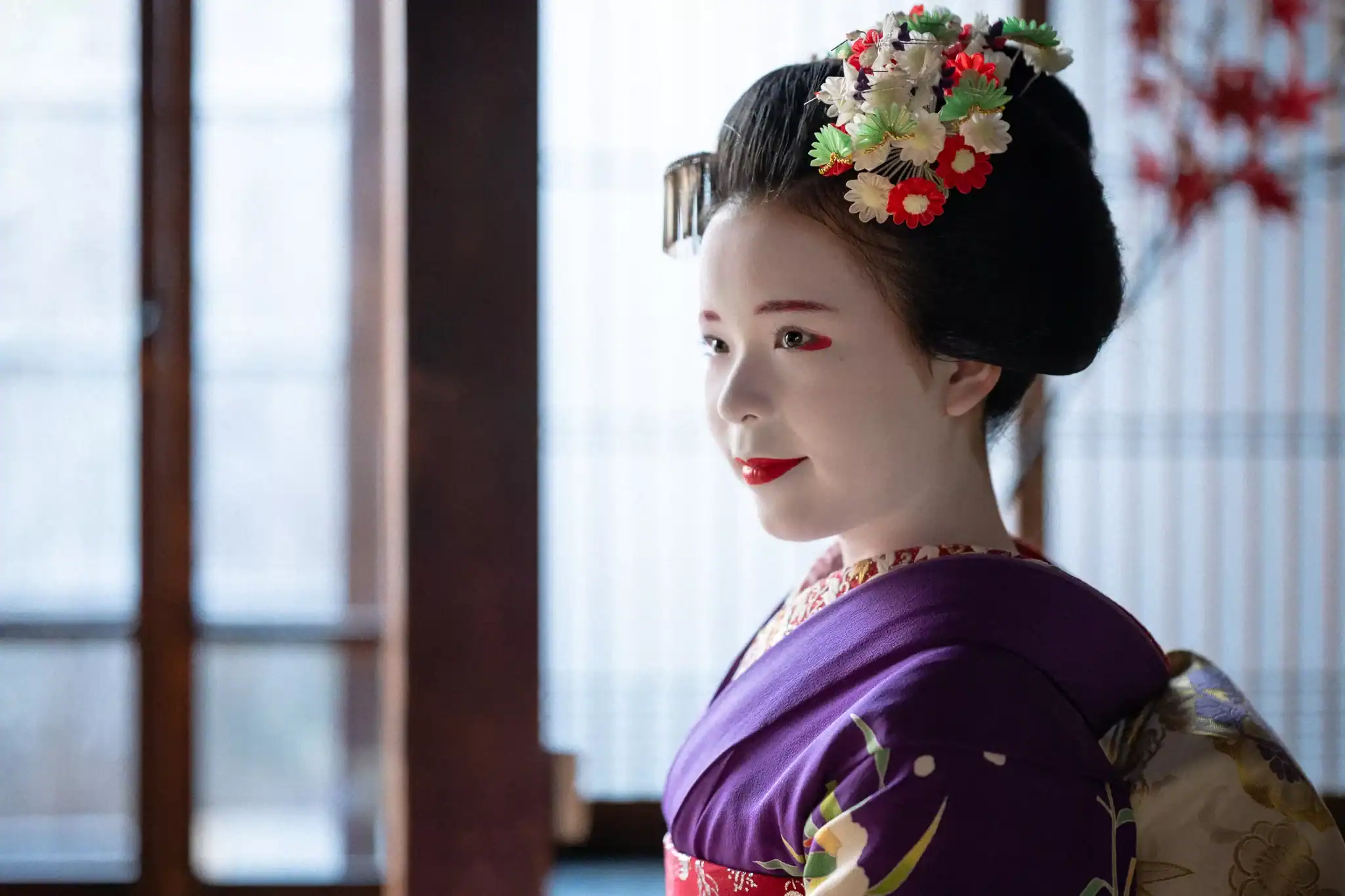 The photoshoot was held at an old merchant house, a venue commonly used for traditional photoshoots. Complete with antiques that could be used as props and architectural features that bordered on the cliche, the stage was set for an afternoon of portrait shooting that I would not soon forget. We spent the first 45 minutes or so discussing the types of shots we wanted, scouting the venue’s various rooms, and setting up lighting equipment. Soon, a cheerful voice called to us from outside the door before it slid open, and the maiko stepped inside.